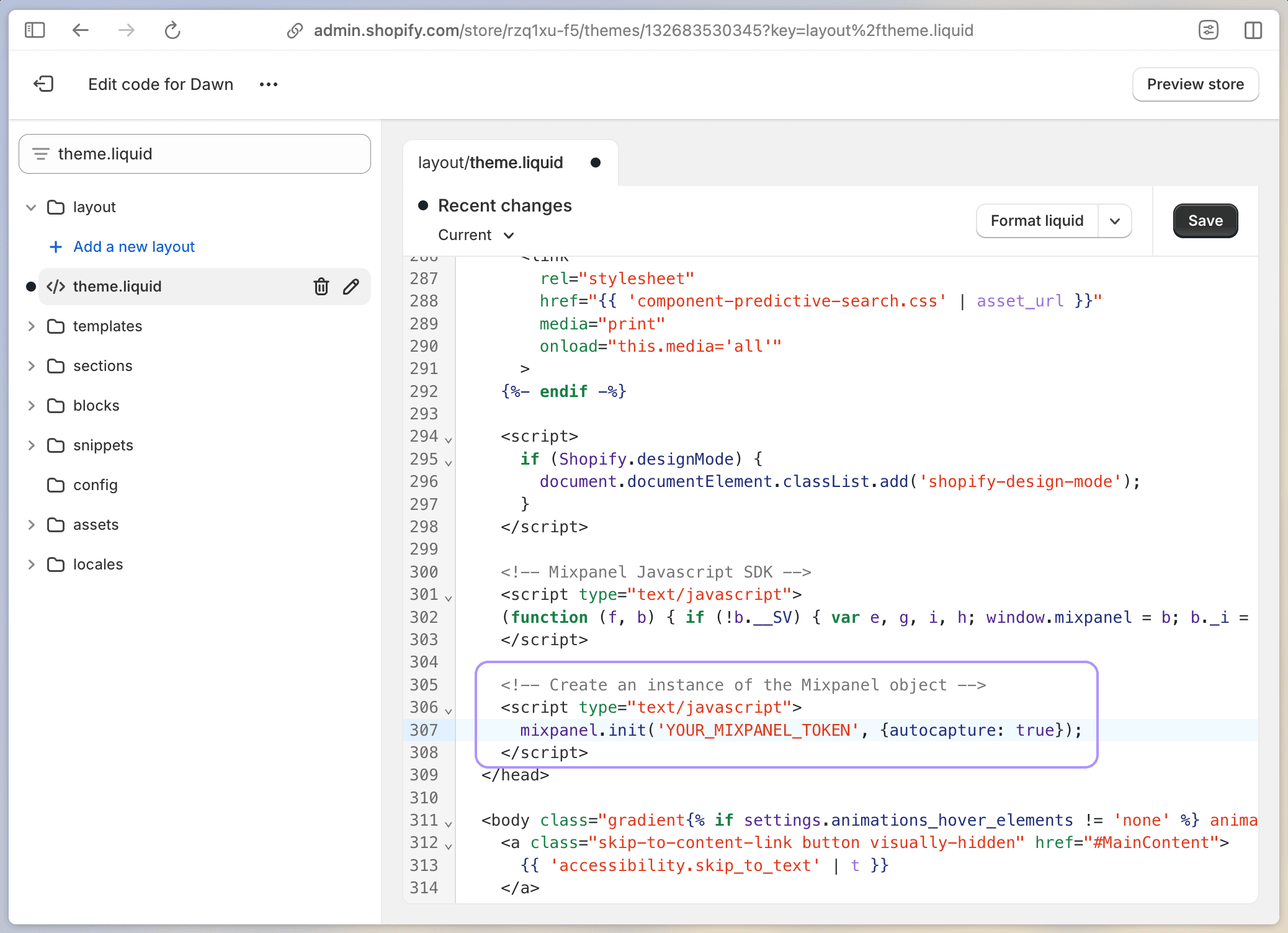 theme.liquidfile, enable Mixpanel’s SDK by adding your Project Token to themixpanel.initcode (wrapped inscripttags). Altogether, it should look like this: